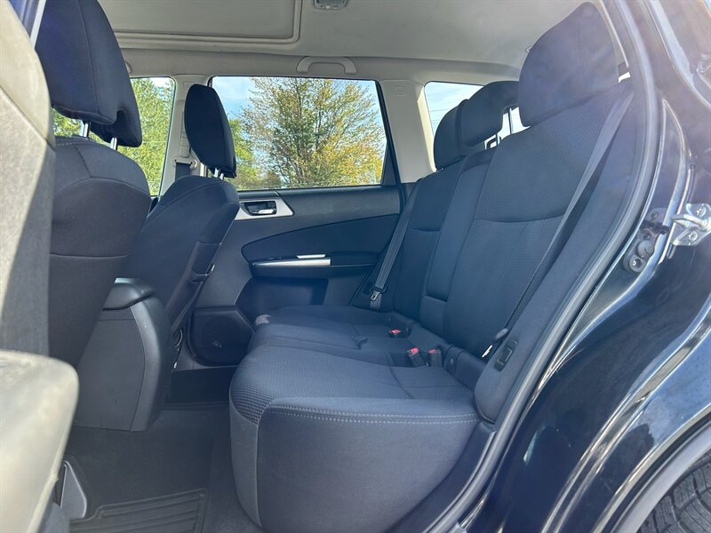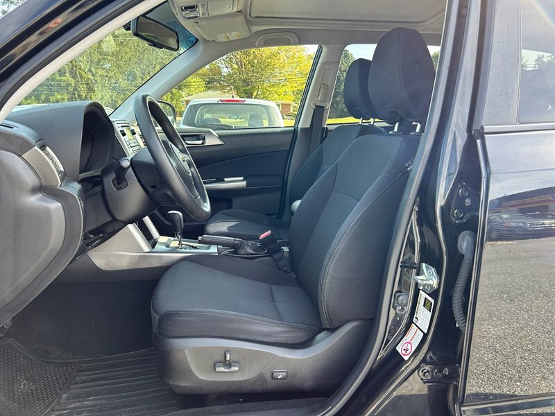 This 2013 Subaru Forester 2.5X Premium in Obsidian Black Pearl with a Black interior is powered by a 2.5L H4 engine, generating 170hp and 174ft. lbs. of torque. With less than 78,000 miles on the odometer, averaging under 6,000 miles per year, this vehicle is in excellent condition. It boasts a fuel efficiency of 21 MPG in the city and 27 MPG on the highway. As a factory default, this Forester comes equipped with a range of features including a panoramic sunroof, heated front seats, a rearview camera, Bluetooth connectivity, and a power driver's seat. The clean CARFAX report and single-owner history add to the appeal of this well-maintained SUV.