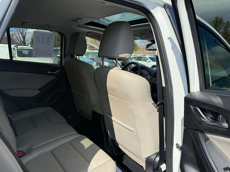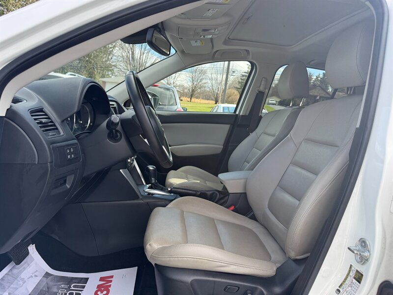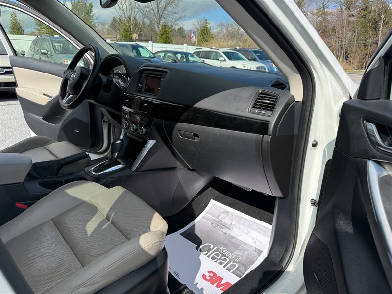 This 2015 CX-5 Grand Touring combines Mazda’s SKYACTIV engineering with a well-equipped Grand Touring trim package. The vehicle is finished in Crystal White Pearl with a Sand leather interior and is in excellent overall condition. It has a clean CARFAX report, shows only one previous owner, and has below 98,000 miles (averaging less than 9,000 miles per year). EPA fuel-economy estimates are 24 MPG city and 30 MPG highway.