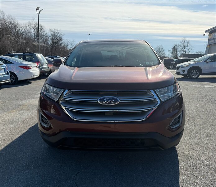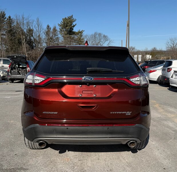 2016 Ford Edge Titanium — Bronze Fire Metallic Tinted Clearcoat exterior with Ebony leather-trimmed interior. Powered by a 3.5L V6 producing 280 hp and 250 lb-ft of torque, paired with a 6-speed automatic transmission. Fuel economy is EPA-rated at 17 MPG city and 25 MPG highway. Vehicle is in excellent overall condition, has a clean CARFAX report, and shows one previous owner.